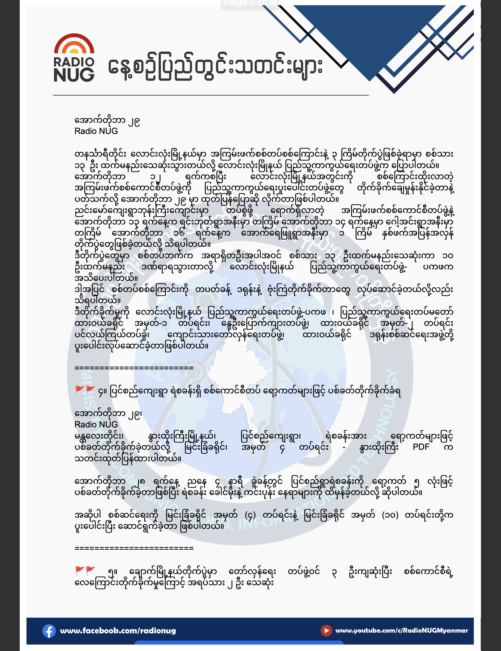 အခုတင်ပြခဲ့တဲ့ သတင်းတွေကို Radio NUG သတင်းထောက် မင်းသီဟန်၊ ကိုခန့်နဲ့ မင်းစစ်သွေးတို့က ပေးပို့ထားတာ ဖြစ်ပါတယ်။