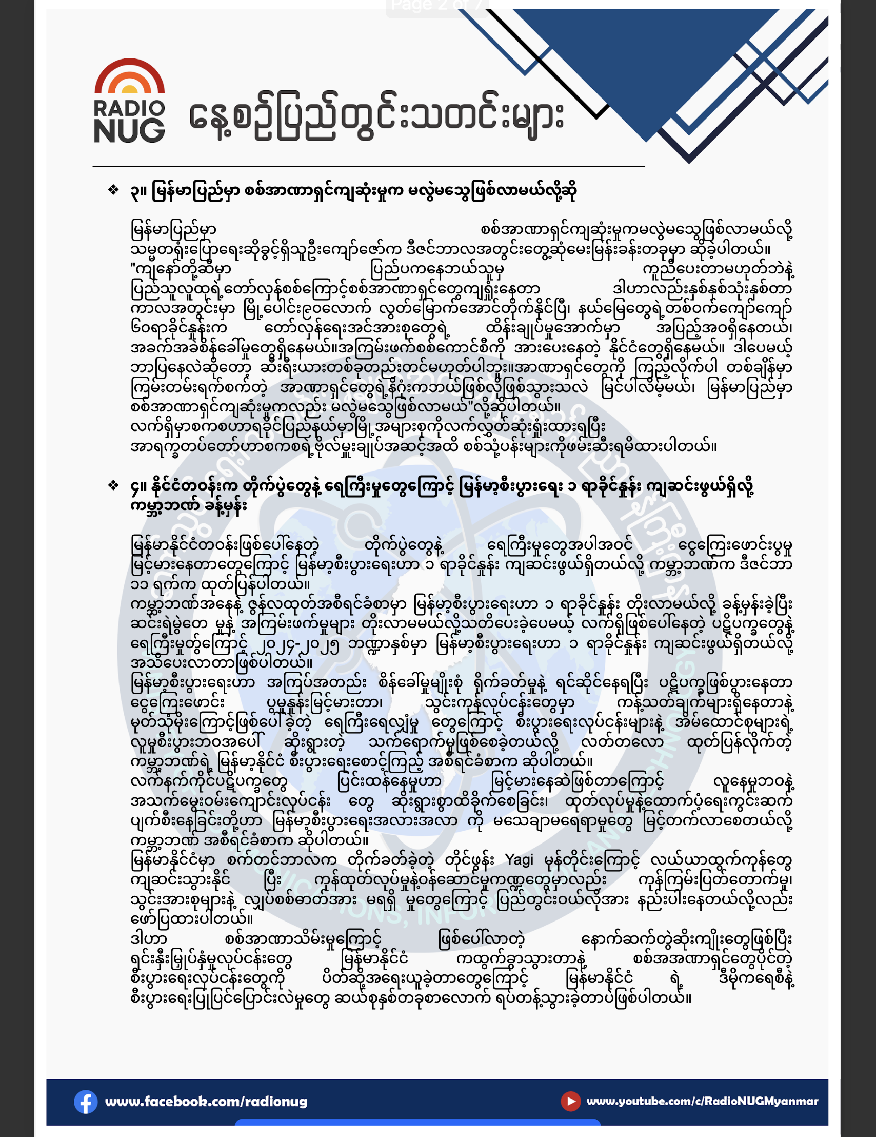 အခု တင်ပြခဲ့တဲ့ သတင်းအတွေကို Radio NUG သတင်းထောက် မင်းသီဟန်နှင့်ကိုခန့်တို့မှ ပေးပို့ထားတာ ဖြစ်ပါတယ်။
